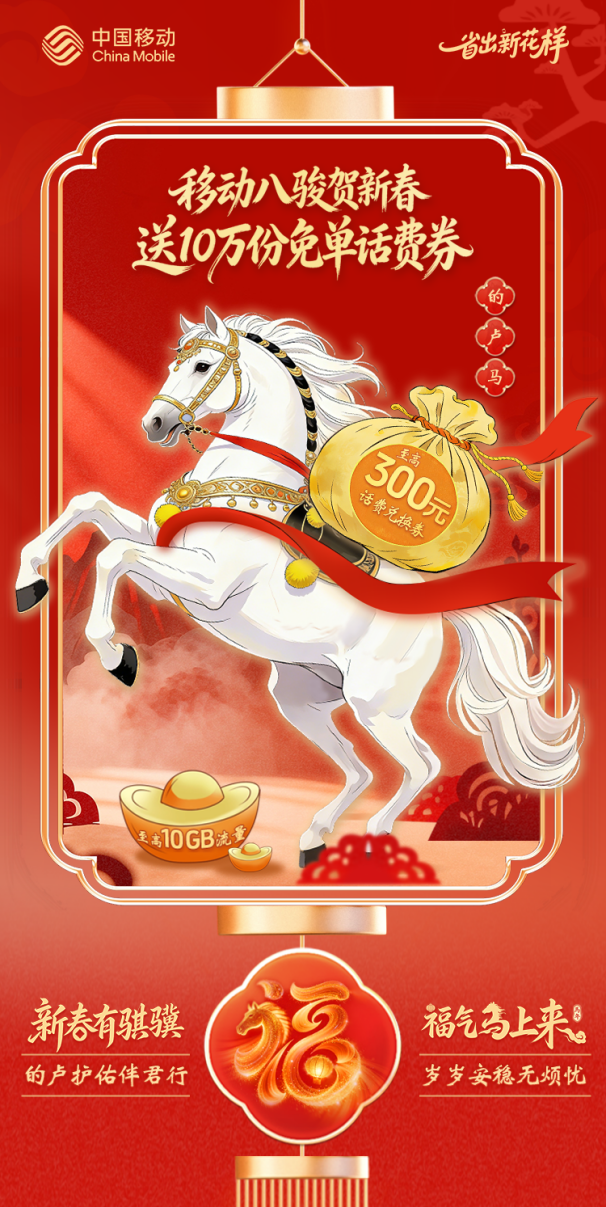 “移动八骏贺新春,送10万份免单话费券”移动年度报告设置八骏马场馆,全面呈现涵盖用户身份、足迹、宽带、爱购、通信等多维度信息的年度报告数据。用户逛骏马村激活名马,可触发“抽月费免单”机会,至高可得300元话费兑换券,还有机会抽取至高10GB流量券。